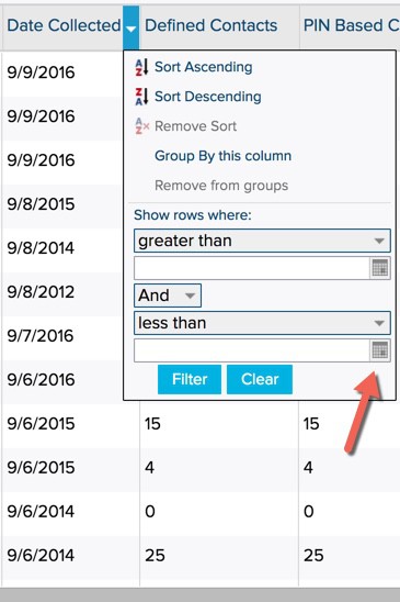 Click the calendar icon to set your “greater than” and “less than” dates, then select Filter.