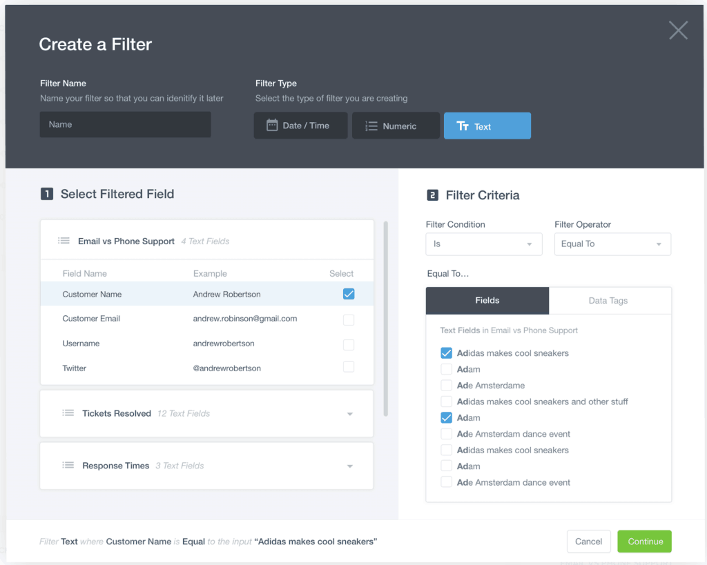 The way you create a filter is brand new in Yurbi v11 as well. When you create a filter, you start by giving it a name and selecting a filter type (Date/Time, Numeric or Text). Based on your selection, you’ll see a list of widgets that are available for that particular dashboard. For example, let’s say you select Text. In the Filtered Field, you’ll see a list of all of the text-oriented fields in that report. You’ll be able to select a particular field (say Customer Name) which can be automatically updated across all of your other reports on a global level, depending on how you decide to filter your dashboards.