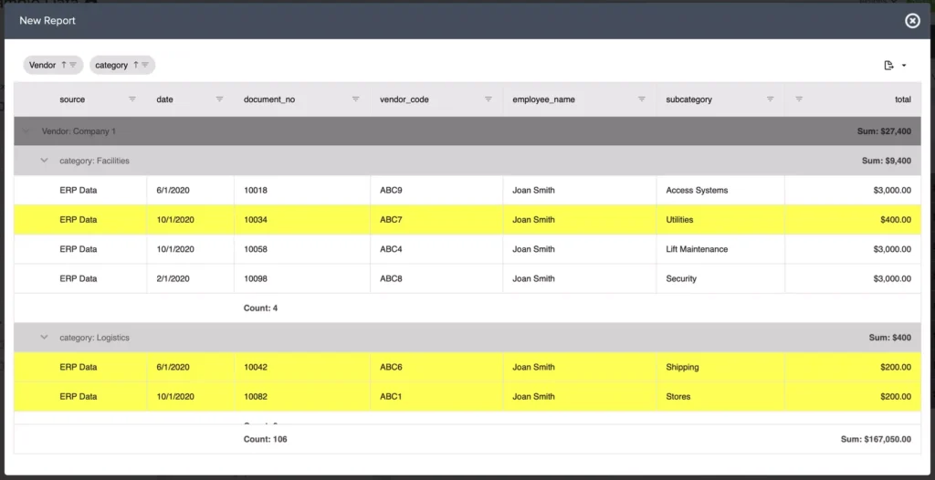 And a new feature recently added is to allow row shading based on the comparison of columns in the grid or by a custom value. In the below example, a rule was set to display any total less than $400 as yellow.