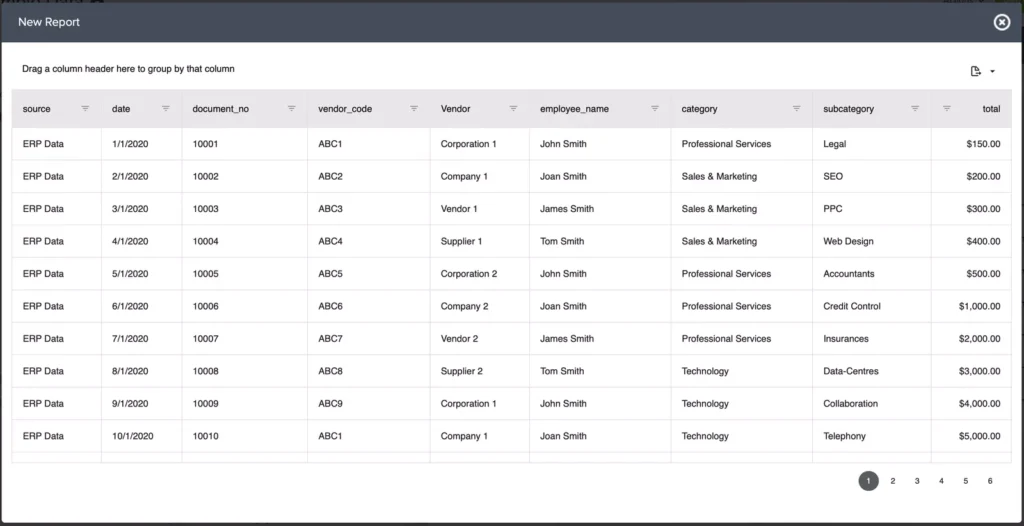 With the standard grid, users have the ability to sort and filter columns, drag and drop to create grouping, and quickly export to excel.